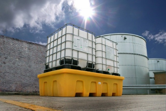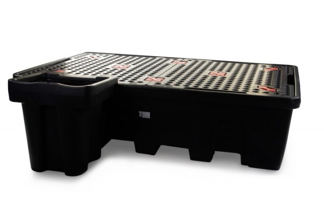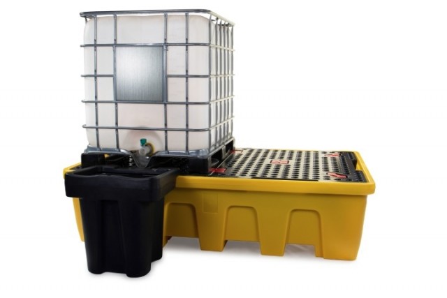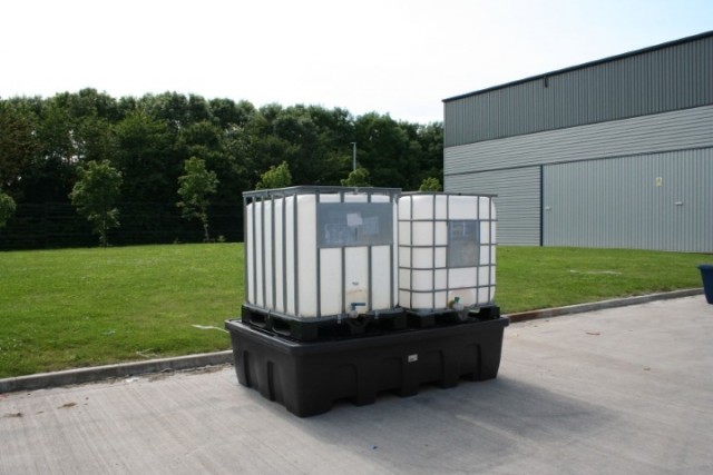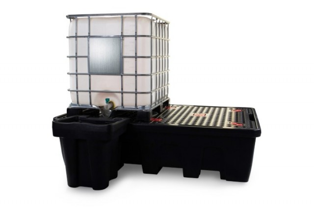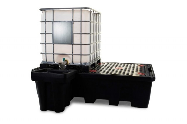 Store containere, store paller. Et stablingsbart oppsamlingskar for to IBC-er.